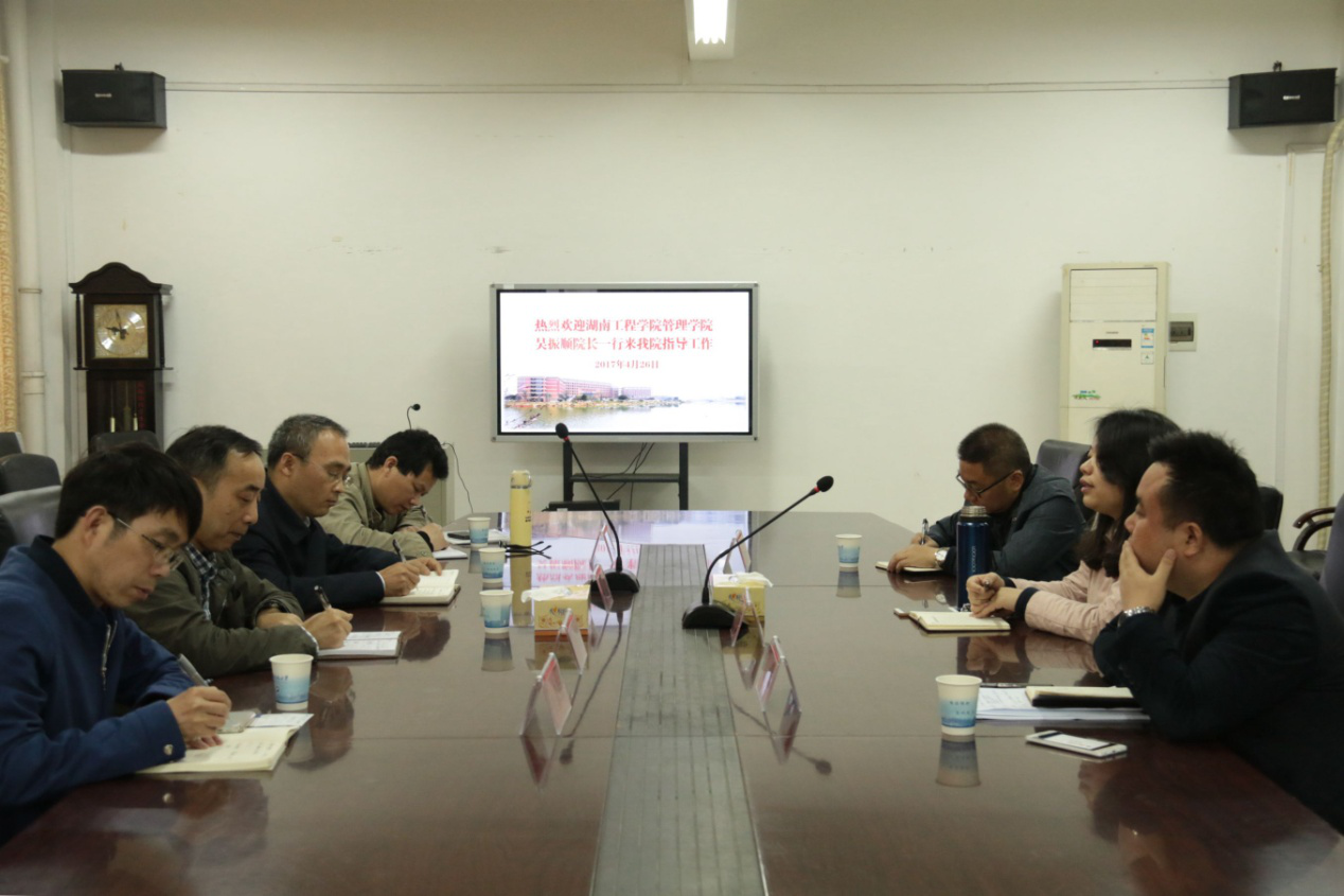2017年4月26日,湖南工程学院管理学院吴振顺院长、黄毅副院长等一行4人来bevictor伟德官网交流。院党委书记仇怡、副院长叶文忠、副院长潘爱民参与了本次会议。