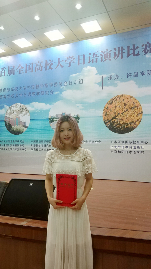 9月23日首届全国高校大学日语演讲比赛在河南许昌学院举行,我校bevictor伟德官网15级旅游管理专业赵勤同学荣获全国二等奖。