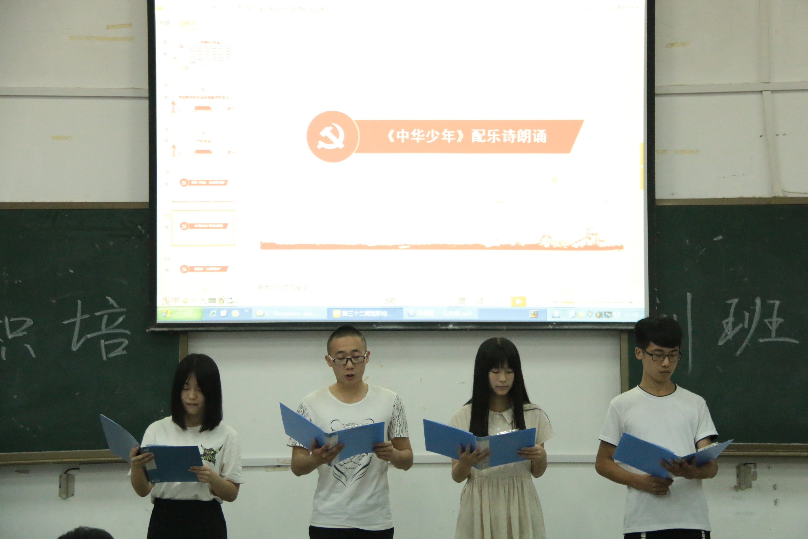 而后,各组代表表演了诗歌朗诵与音乐剧,如:《中华少年》配乐诗朗诵、《红船、从南湖起航》、情景剧《人民的名义》、合唱歌曲《国家》,带我们重温历史。历史赋予了我们中华少年使命,合唱《国家》表达了我们的爱国之情,情景剧《人民的名义》表明我党惩治腐败的决心,同学们用自己的行动证明了自己培训的收获与感悟。
