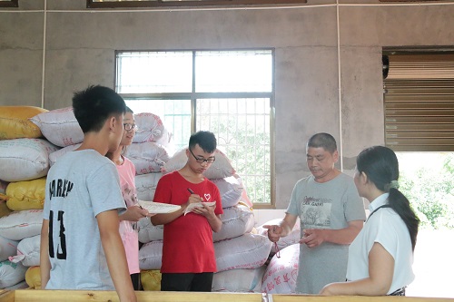 为了使调研小组详细了解到羊鹿茶叶的生产过程,负责人带大家前往基地的仓库。为了保证茶叶的纯天然,羊鹿茶叶采用了传统制茶工艺,从采茶到成品茶要经历20多道复杂而又严格的工序。其中羊鹿茶叶基地的新茶采摘后要先倒在由一格一格的纱网上,纱网底部通风,使新茶保持干燥不损坏新茶的结构,以此保证茶业的口感。在走访过程中,负责人还热情地用羊鹿茶叶泡了几杯茶招待大家,他骄傲地说道:“我们这个羊鹿茶是一芽一叶,泡出来的茶黄绿明亮,又香又新鲜!”随行的杨美琴老师忍不住连连夸赞:“这个口感确实不错啊!”